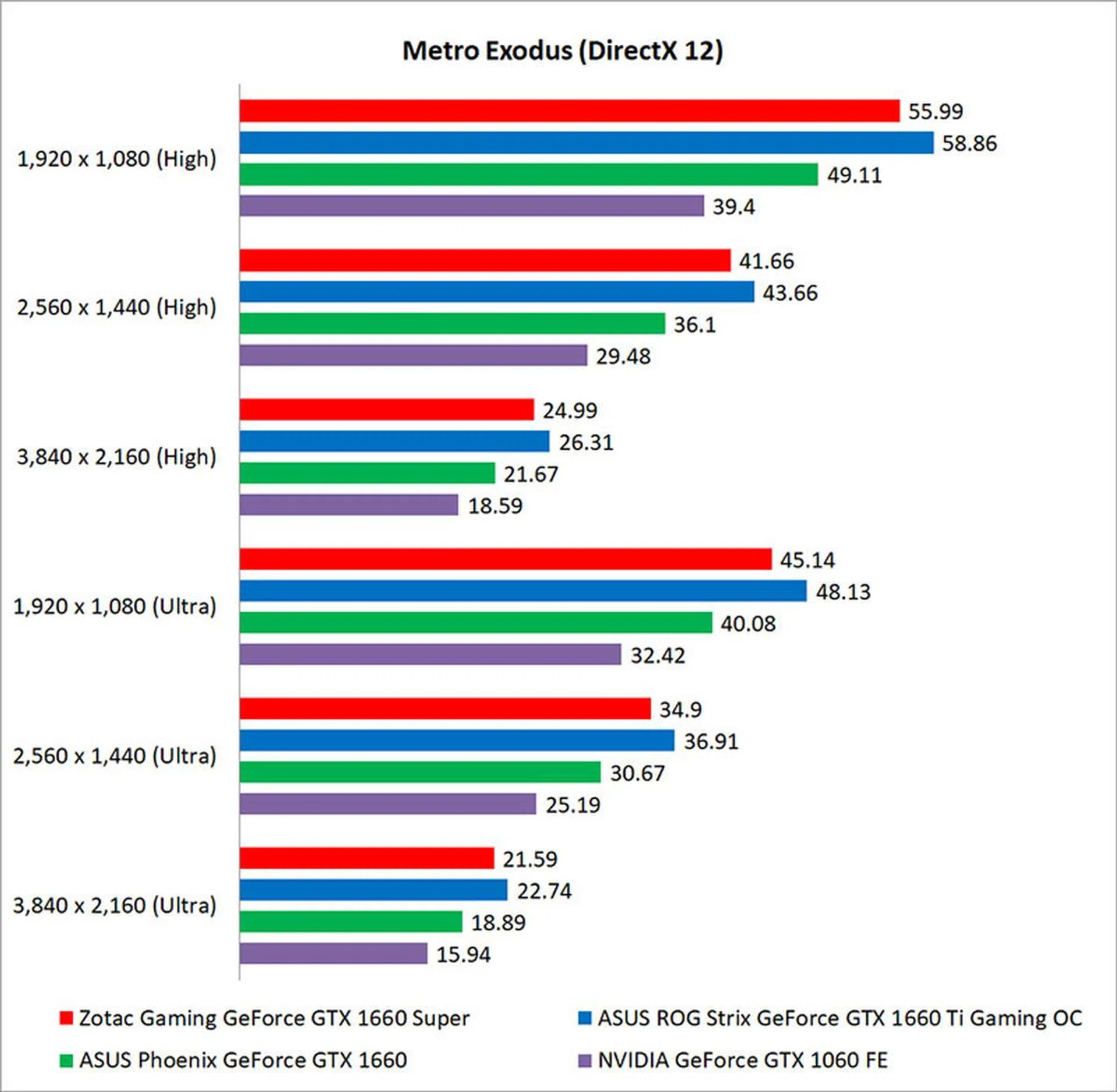 Metro Exodus is one of the most demanding games to run today, even at just 1080p and High settings. The GeForce GTX 1660 Super doesn't quite manage to hit 60FPS, but it comes close enough, a decent showing for a card that's part of NVIDIA's entry-level line-up. Compared to the GeForce GTX 1060 6GB, it's also a good 34 per cent faster.