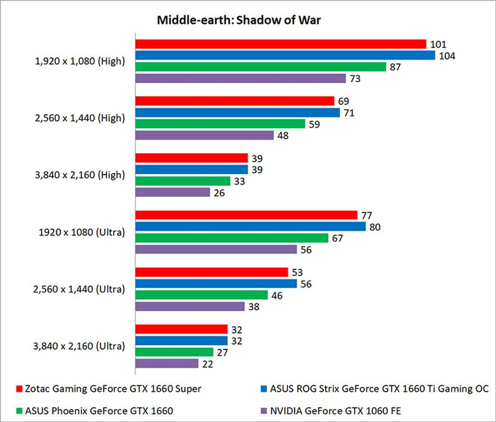 The GeForce GTX 1660 Super closes the gap further with the GeForce GTX 1660 Ti in Middle-earth: Shadow of War. At 1440p and High settings, it's barely 3 per cent behind. The new Super card continues to outpace the older GeForce GTX 1060 6GB by a good amount though, coming in at a whopping 35 per cent faster.