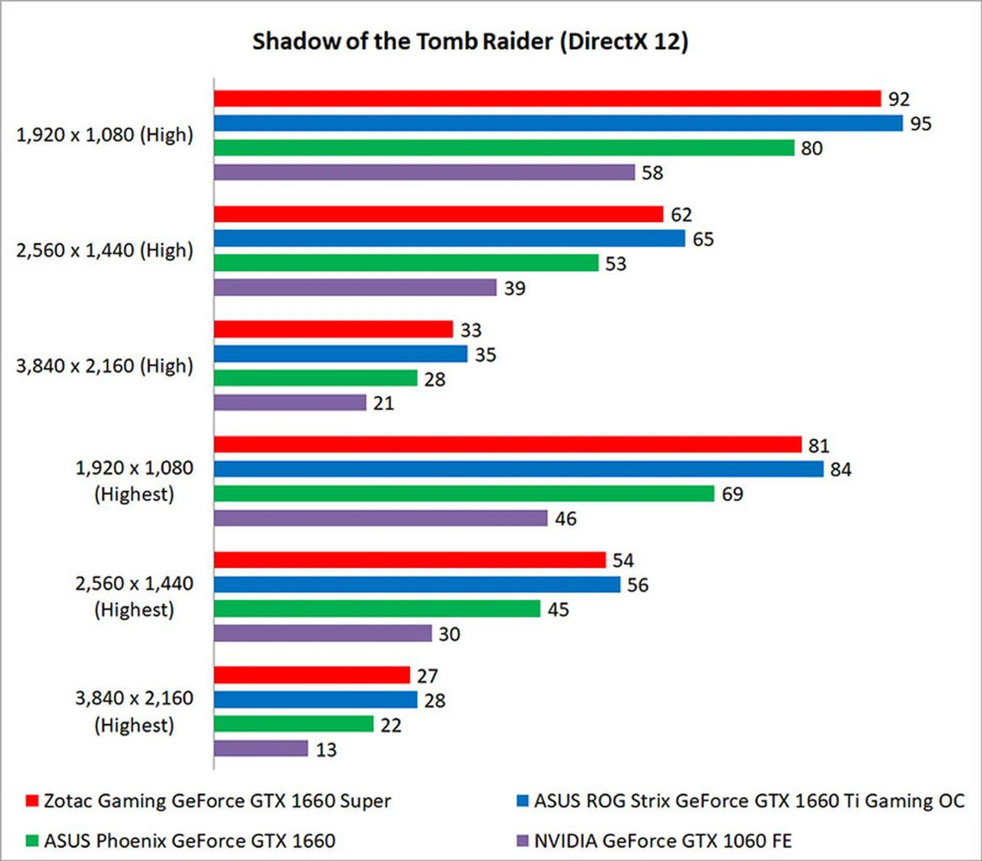 In Shadow of the Tomb Raider, the GeForce GTX 1660 Super once again proves itself a worthy alternative to the GeForce GTX 1660 Ti. In fact, the latter is barely 5 per cent faster than its Super counterpart. Meanwhile, the GeForce GTX 1060 6GB continues to show its age, trailing the GeForce GTX 1660 Super by a whopping 45 per cent.