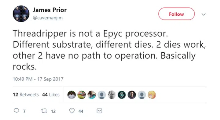 But in a tweet addressing the matter, AMD’s James Prior reaffirmed that Threadripper is not an EPYC processor. They reportedly use completely different substrates and dies, and appearances notwithstanding, two of the Threadripper dies are “basically rocks” for all intents and purposes.