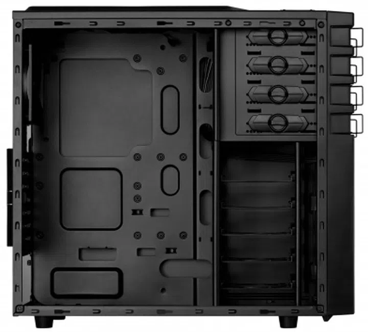 Sporting a black scheme with military green accents, the GX700's tactical appearance is complemented with rugged-looking fan control switch, eight functioning clasps, a removable and perforated front air filter, along with a bright red power button.