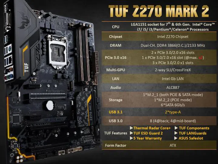 The Z270 TUF series will be available in two variants: Mark I and Mark II. Below are the specifications for both motherboards.