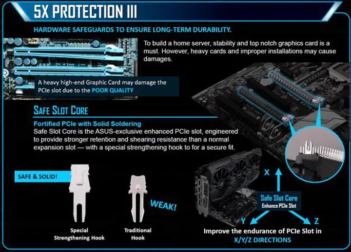 As an extra added bonus, the PCIe slots of all Z270 Prime motherboards have been fortified with Solid Soldering, so that they don’t get damaged over long periods of time with heavy high-end graphics cards that are fitted with massive heatsinks and cooling fans.