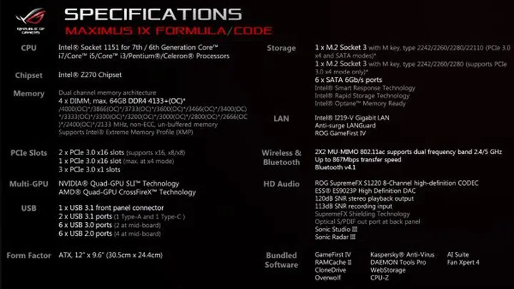 The image below is the full specifications of the Maximus IX Code motherboard, alongside a summarized component list for both the Formula and Code.