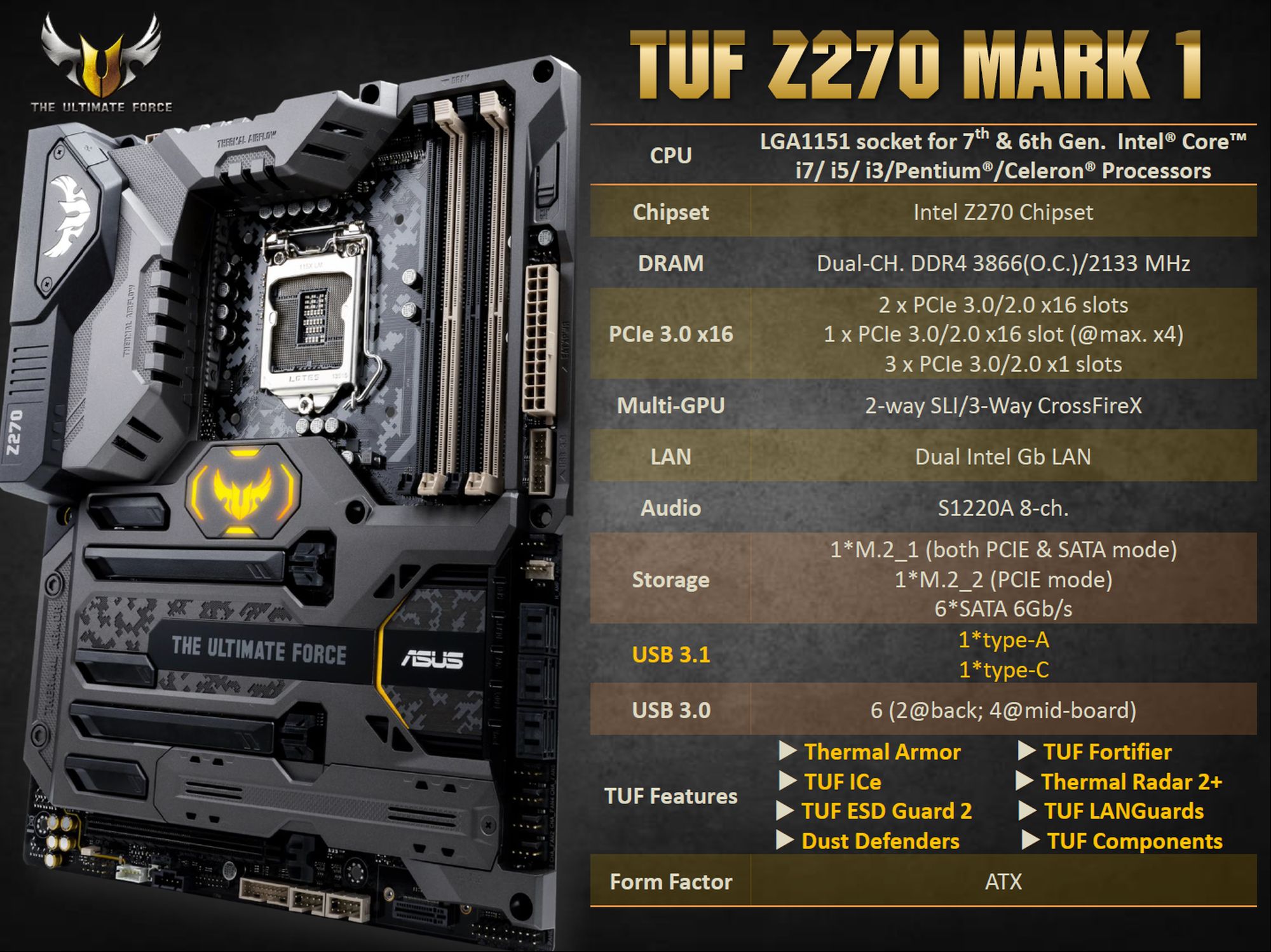 ASUS' TUF series motherboard has returned. Seen here is the TUF Z270 Mark I.