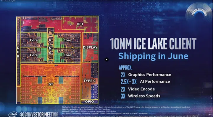 According to Intel, the Ice Lake chips will have twice the graphics performance and video encoding speed, 2.5 to 3.5 times the AI performance, and 3 times the wireless speeds of Coffee Lake. Intel is still sticking to the ring bus architecture though, but there is now an integrated USB-C controller on-die.
