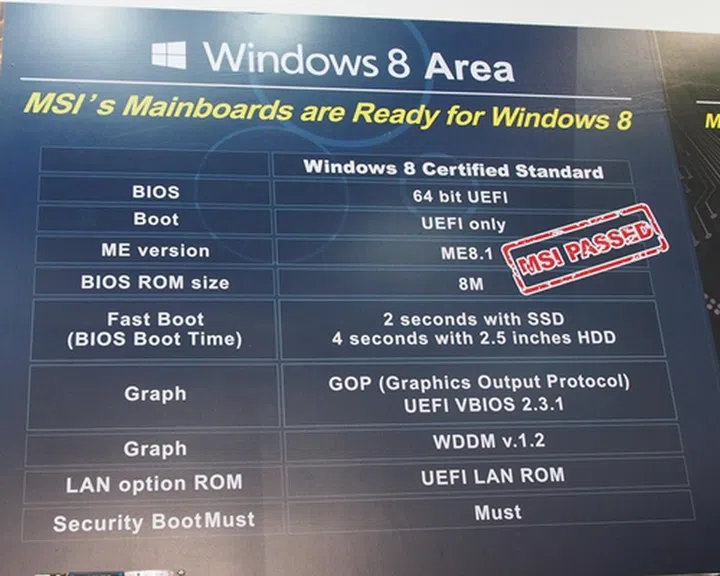 With the pending release of Microsoft's Windows 8, MSI revealed its mainboard products are certified for Windows 8 and highlighted features such as Fast Boot and Secure Boot technologies.