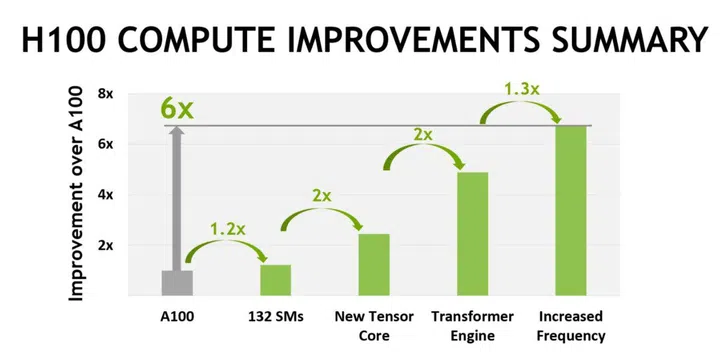 Performance leap of H100 vs. A100. Click to view a larger image.