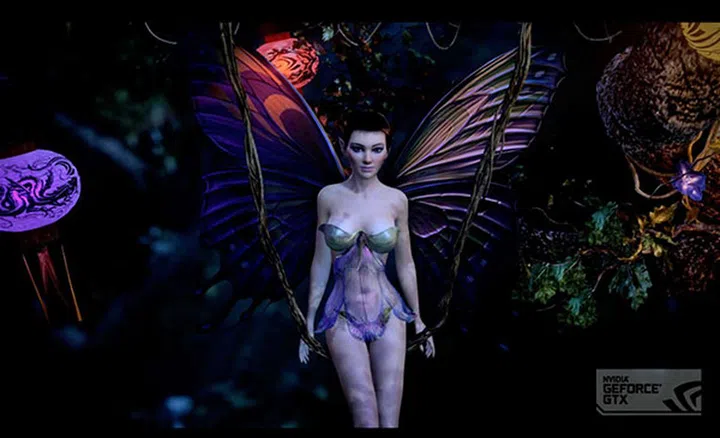 Now 10 years later, NVIDIA has resurrected Dawn by way of a new demo called “A New Dawn”. Naturally, the Dawn of today is way advanced than the one in 2002, though still as skimpily dressed. For one, the original Dawn had our winged fairy in a giant environmental cube map, whereas A New Dawn is set in a full 3D environment. Also, the original Dawn’s hair was made up of 1,700 static strands, compared to 40,000 tessellated strands on the new Dawn. Of course, all these (and more) are made possible by DirectX 11 tessellation.