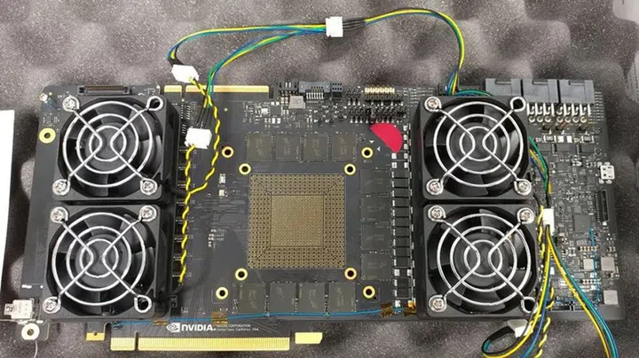 The PCB can also be seen to have three power connectors and what may be an NVLink interface, but these aren’t really indicative of anything as engineering samples are often overprovisioned so they can be tested at their limits.