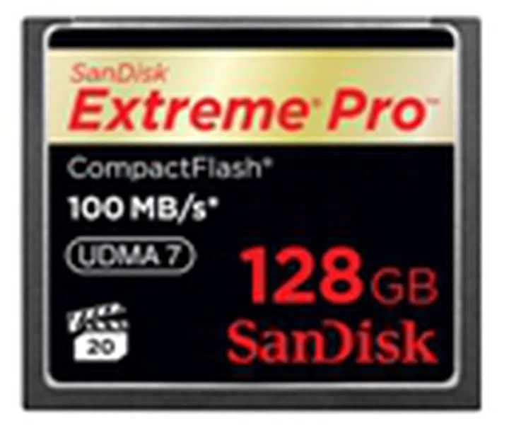 The SanDisk ExtremePro CompactFlash card features 128 gigabytes (GB) of storage and up to 100 megabyte per second (MB/sec) write speeds. With its Power Core controller and UDMA-7 interface, the card delivers the performance demanded by high-end DSLR cameras.