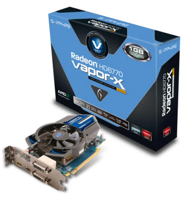 The SAPPHIRE HD 6770 family has includes two models with 800 Stream processors and core clocks of 850MHz with either 1GB or 512MB of GDRR5 memory and DVI, HDMI and DisplayPort outputs. There is also an overclocked model with SAPPHIRE’s award winning Vapor-X cooler for quiet and efficient operation with the output configuration of Dual DVI, HDMI and DisplayPort outputs.