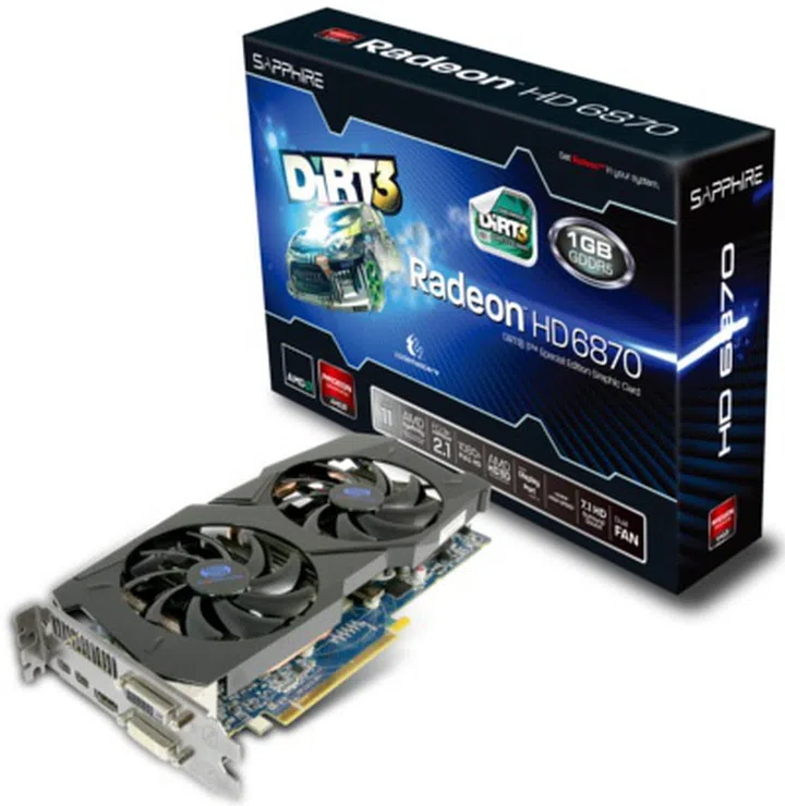 The SAPPHIRE HD 6870 Dirt3 Edition has the same internal architecture as the standard model, with 1120 stream processors and 56 texture processing units, but clock speeds are increased to 920MHz for the core and 1050Mhz (4.2Gb/sec effective) for the 1GB of GDDR5 memory giving users a boost in performance. The new SAPPHIRE exclusive cooler design has Dual fans to keep this model cool and quiet even when under load conditions, keeping even extreme gamers happy! This new design has two 90mm fans with thin impellers that can move the same amount of air at 10% lower rotation speeds than conventional fans, keeping noise low, and their special dust repelling bearings contribute to high reliability.