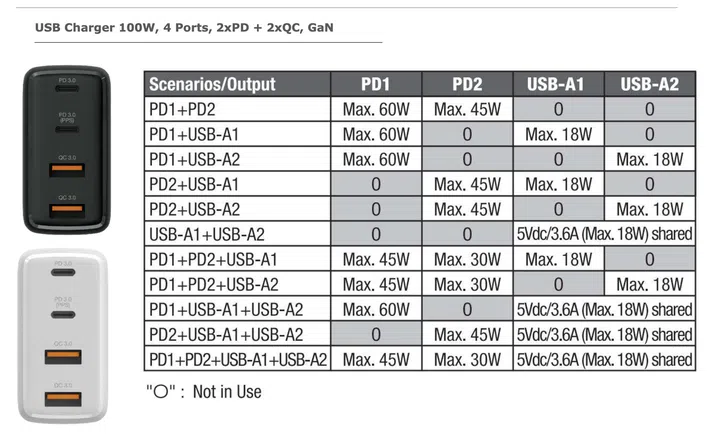 If all ports are used, the first USB-C port delivers 45W of power, the second gets 30W, and the two USB-A ports share 18W between themselves.