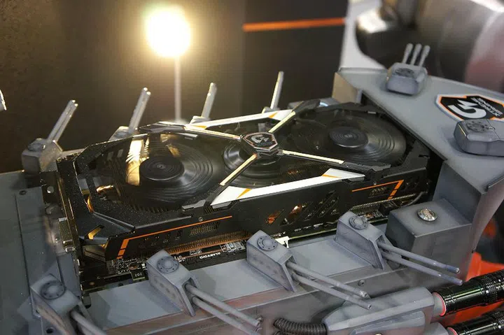 The graphics card was located further ahead of the battleship which definitely requires custom interfaces to bridge it with the motherboard's PEG slot.