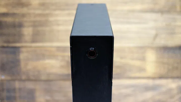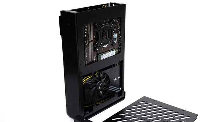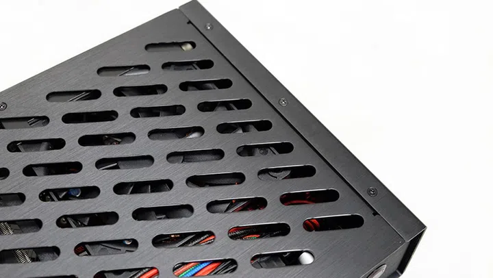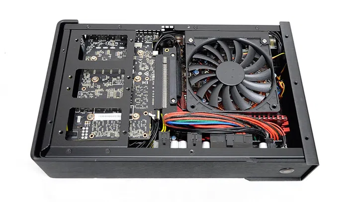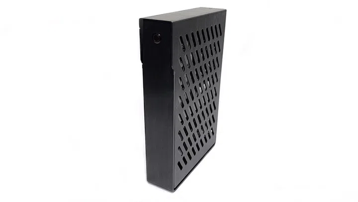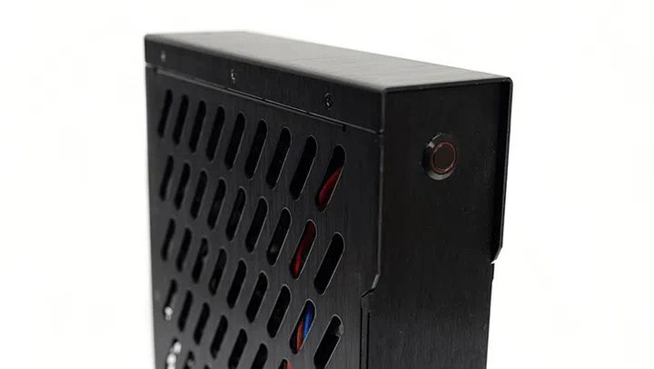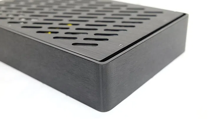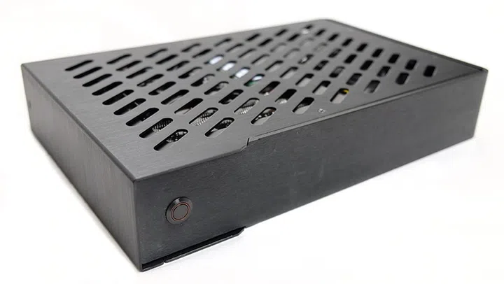 The chassis is a Not From Concentrate S4 Mini, a 4.3L case that can house up to an NVIDIA GeForce GTX 1070. The aircraft-grade aluminum chassis is both light and robust, with a powder-coated exterior for a nice textured finish. Both left and right side panels are perforated, revealing the interior.