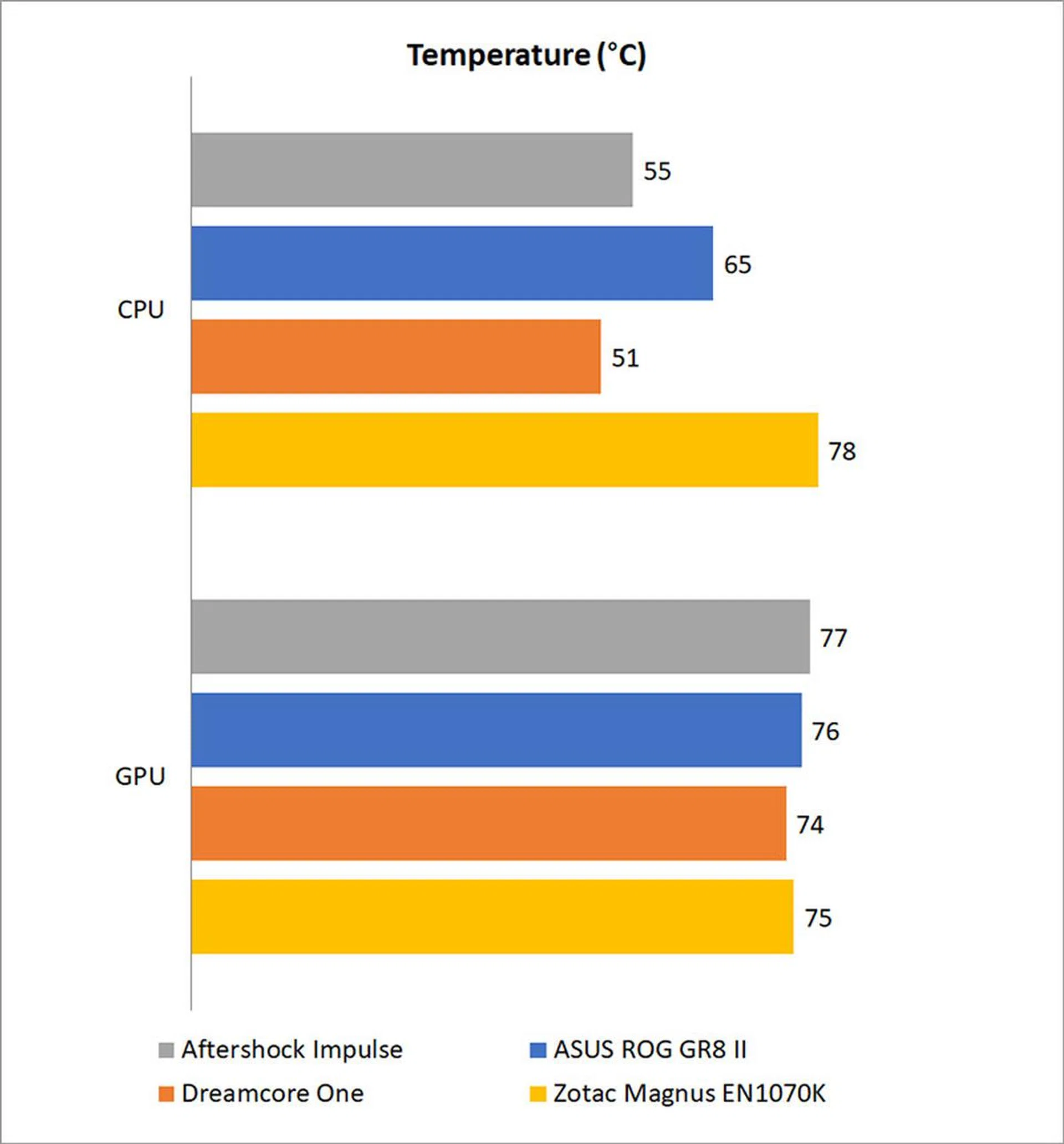 As two of the larger systems, the Aftershock Impulse V2 and Dreamcore One posted the coolest CPU temperatures. In fact, the Dreamcore One managed to edge ahead thanks to its use of the aftermarket Zalman cooler (newer units now use a Noctua model).