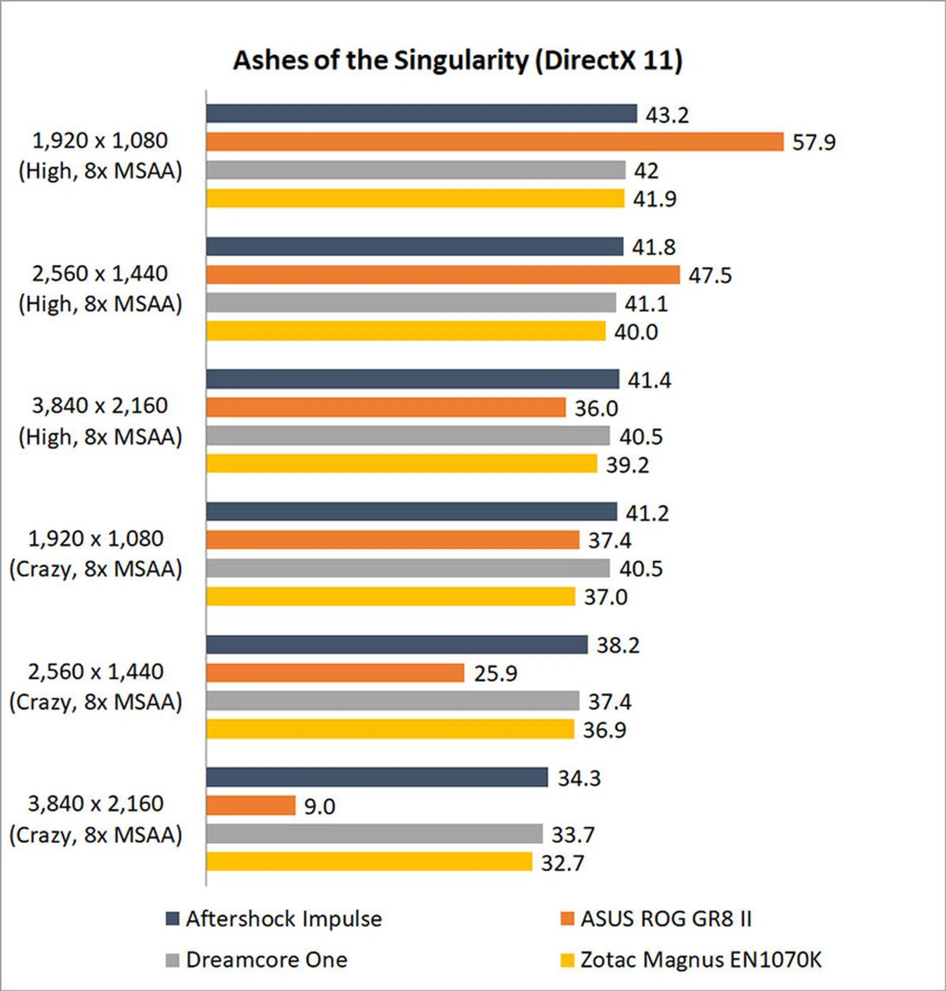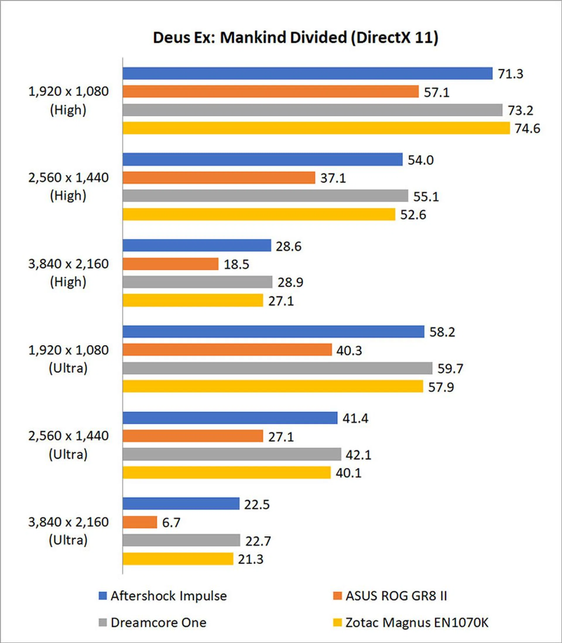 Deus Ex: Mankind Divided can really push a system with the settings and resolutions cranked up, but the GeForce GTX 1070 in the Aftershock, Dreamcore, and Zotac PCs handled it quite well. There aren’t really any significant differences between those three machines, and it’s impressive to see how well the Zotac card performed given its diminutive size.