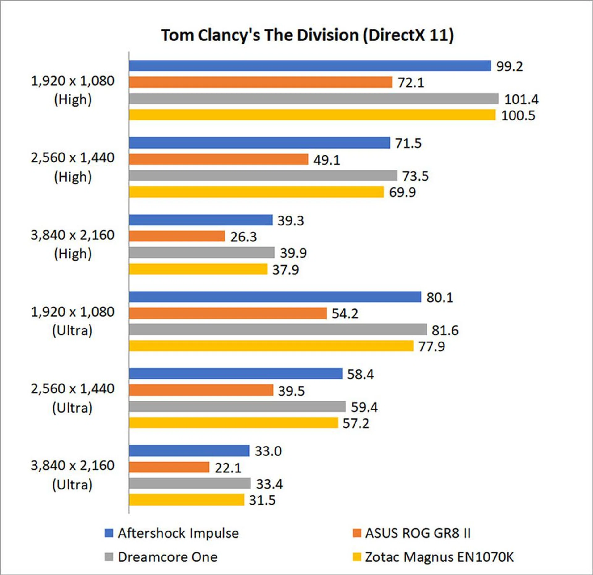 We see more of the same in The Division, where the Aftershock, Dreamcore and Zotac systems posted very similar results and the ASUS continued to trail behind. At 1080p and High settings, the performance gap was roughly 39 per cent.