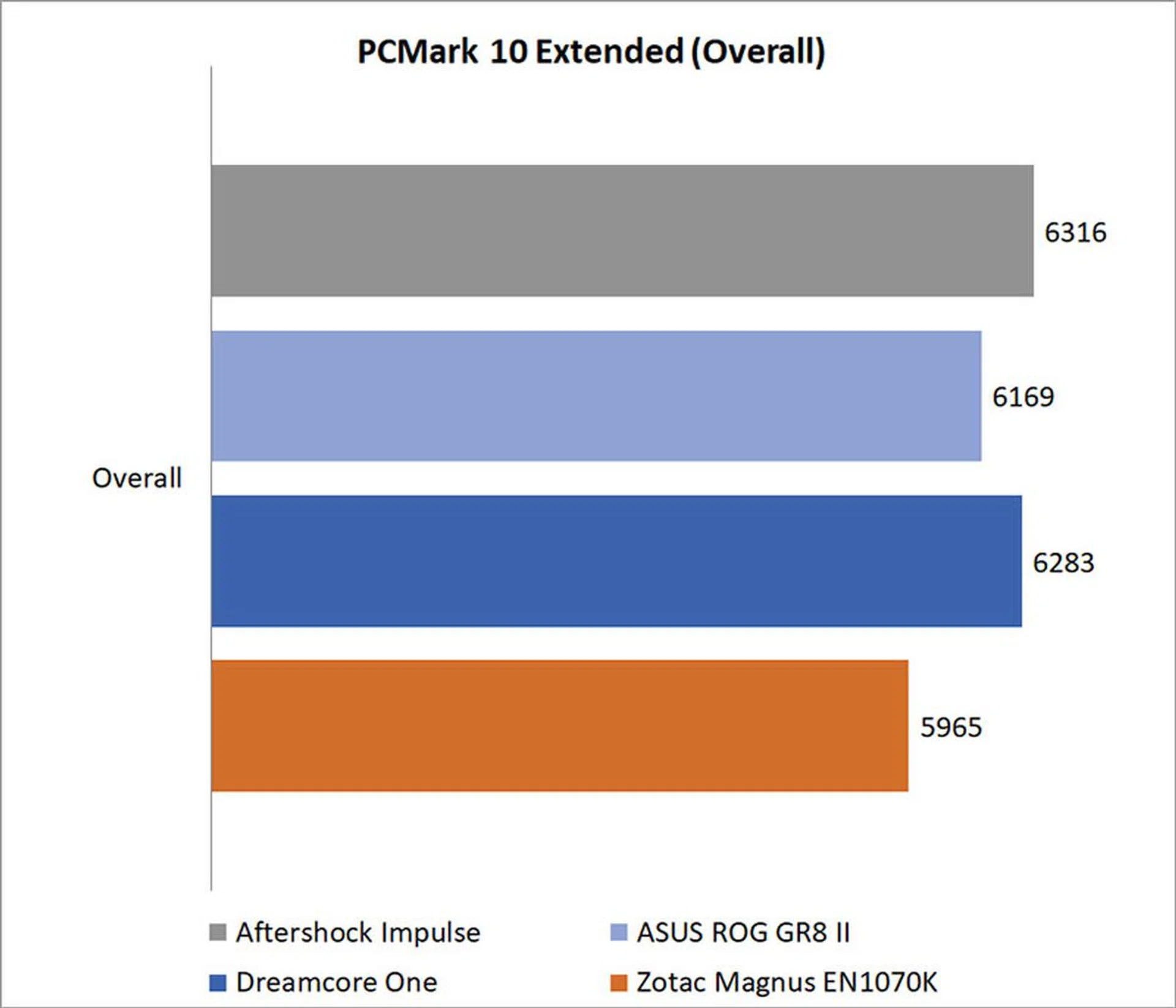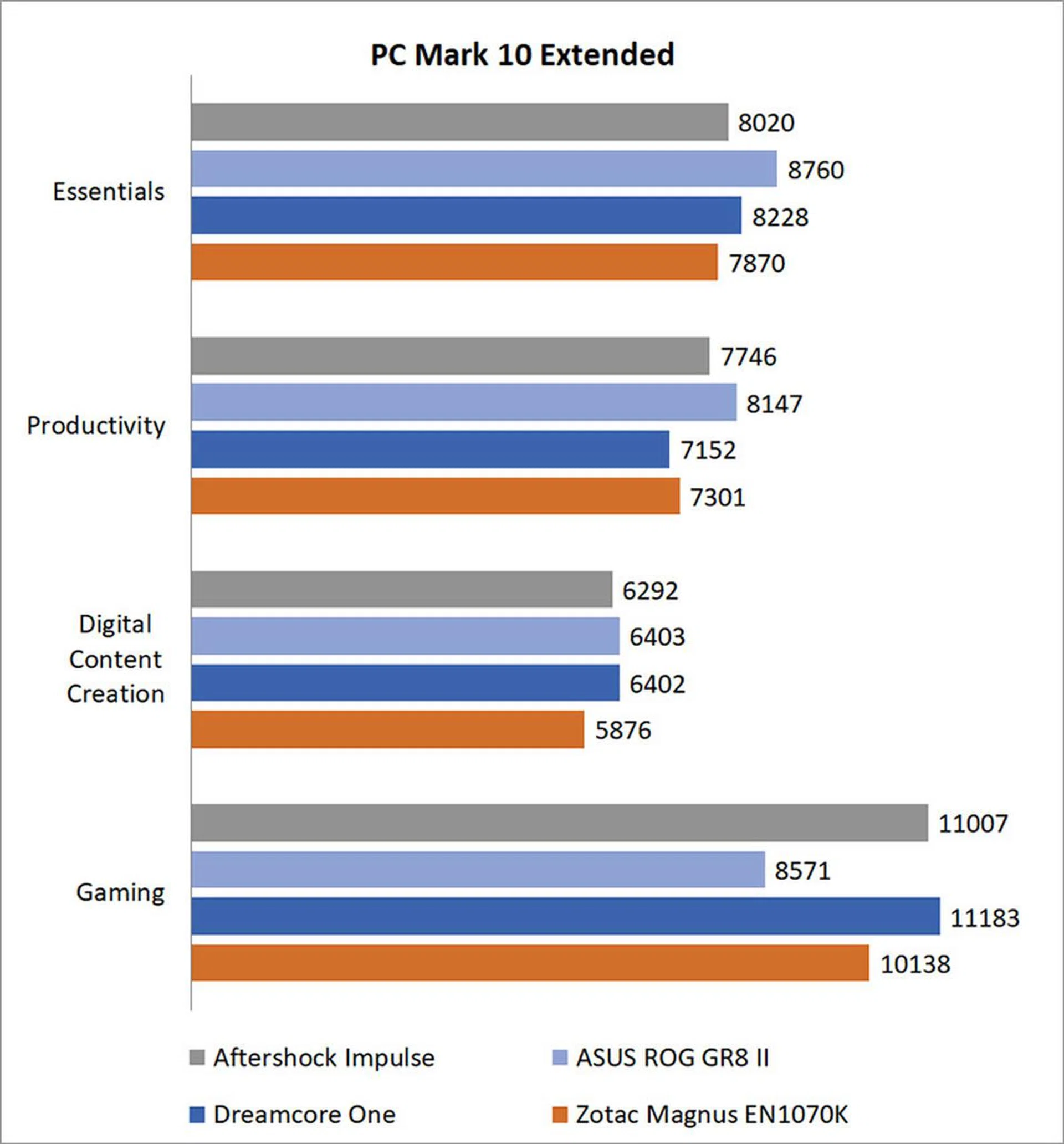 The Aftershock Impulse V2 inched ahead here in terms of the overall score, but the Dreamcore and ASUS PCs weren’t far behind. The Zotac lagged behind more, probably due to its lower power Intel T-series CPU. The latter has better graphics performance than the ASUS system, but PCMark 10 also takes into account CPU performance.