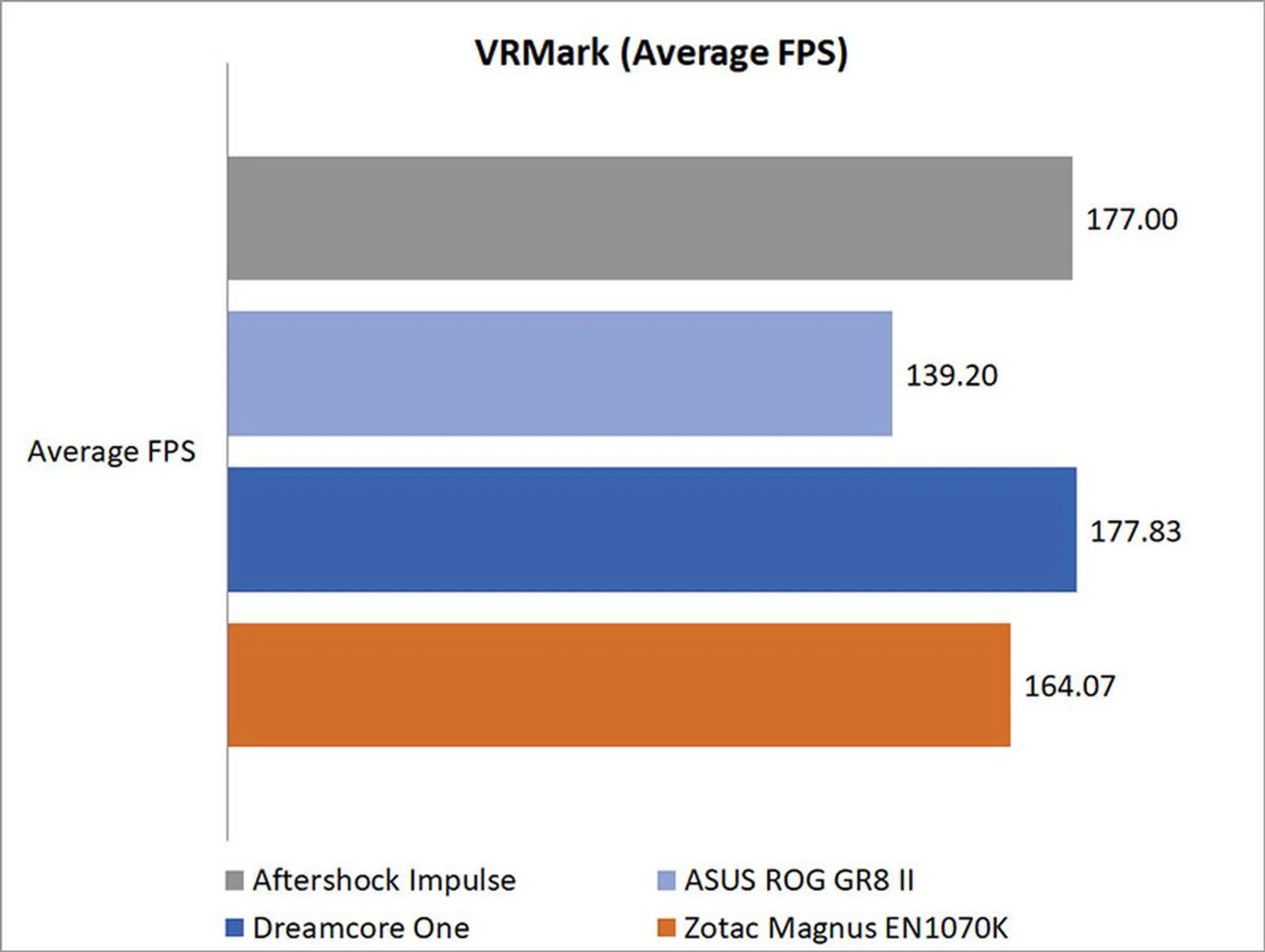 Futuremark’s VRMark benchmark is designed to assess a PC’s ability to handle high-performance headsets like the HTC Vive and Oculus Rift. If a PC passes the Orange Room test, it is ready for the latter two systems. We’ve also included a separate graph with the average frame rates to show how far they exceed the target frame rate of 109FPS.