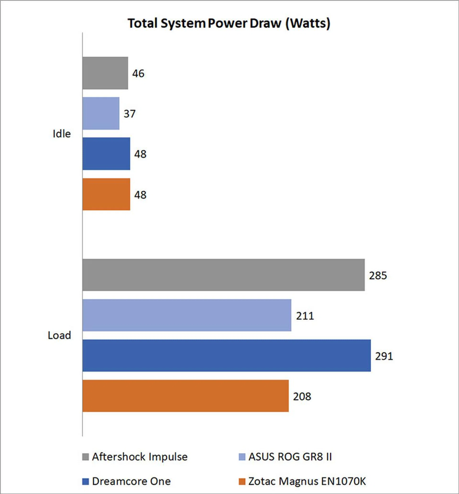 Unsurprisingly, both the Aftershock Impulse V2 and Dreamcore One drew the most power, thanks to their full-fledged desktop-class components. On the other hand, the ASUS ROG GR8 II uses a soldered NVIDIA GeForce GTX 1060 3GB card, while the Zotac uses a 35W T-series processor, so they naturally weren’t as power hungry.
