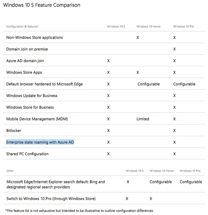 In terms of lineage, it’s also closer to Windows 10 Pro than the short-lived RT or even Windows 10 Home. It supports Intune, Azure Active Directory Join, Enterprise State Roaming via Azure AD, full BitLocker encryption, Windows Update and Windows Store for Business, and plays nice with mobile device management policies. If this isn’t enough, you can easily unlock Windows 10 Pro on a Windows 10 S device. At the moment, Microsoft is making this upgrade free until the end of 2017; after which, it’ll cost US$49. You won’t find this flexibility on Chrome OS. (Update: Here's a Windows 10 S FAQ from Microsoft.)
