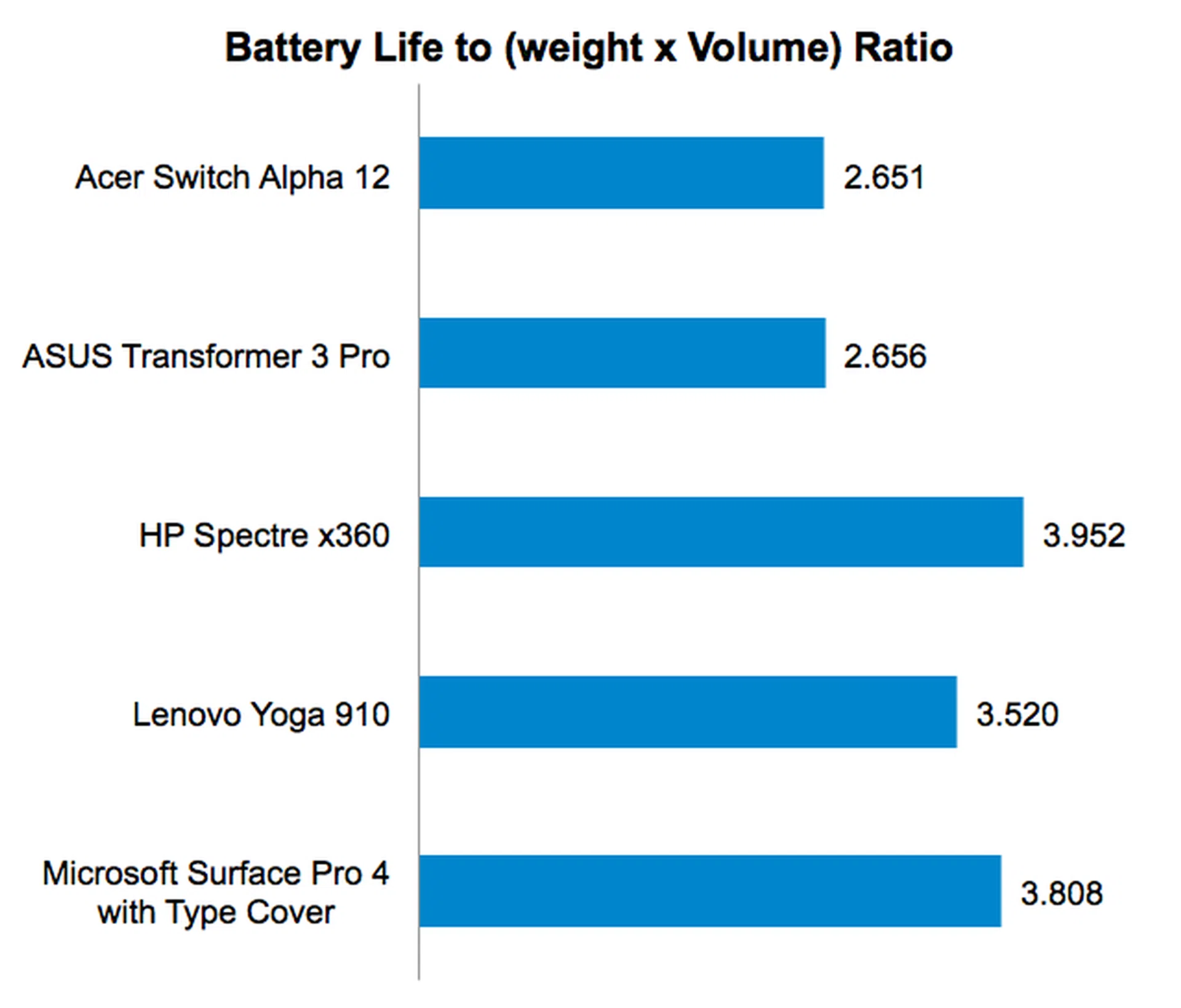 Our portability index takes into account battery life, weight, and volume to provide a measure of how easy a notebook is to carry around relative to other compared systems, the higher the figure, the better. Thanks to its slim dimensions and light weight, the HP Spectre x360 was the clear leader in this test. The Yoga 910 was quite close, but its scores suffered because of its larger footprint. The ASUS Transformer 3 Pro’s poor battery life meant that even though it is comparable to the Microsoft Surface Pro 4 in terms of dimensions and weight, its final portability score was poor. The Acer Switch Alpha 12’s battery life was decent, but it was let down by its slightly bulkier dimensions.
