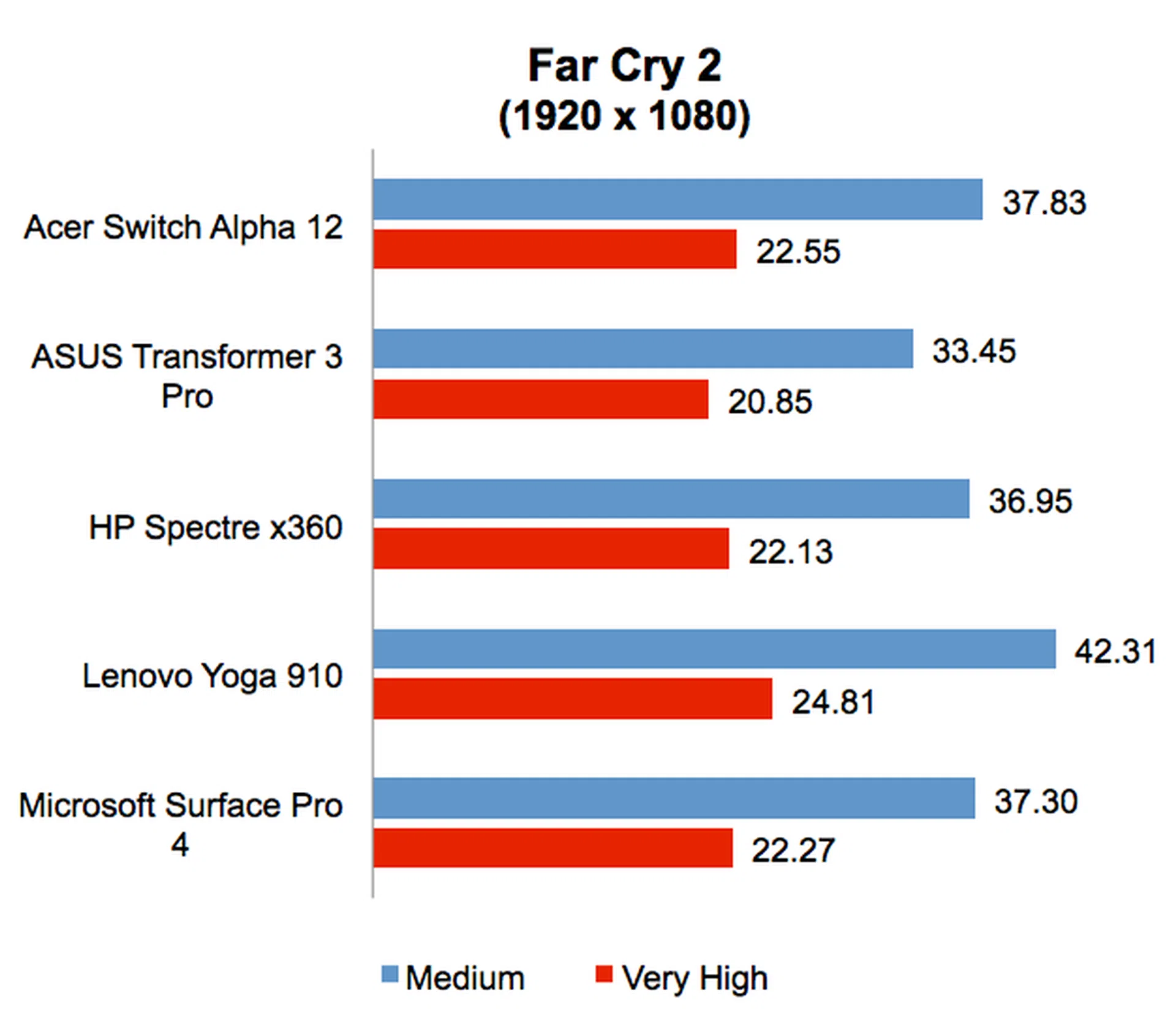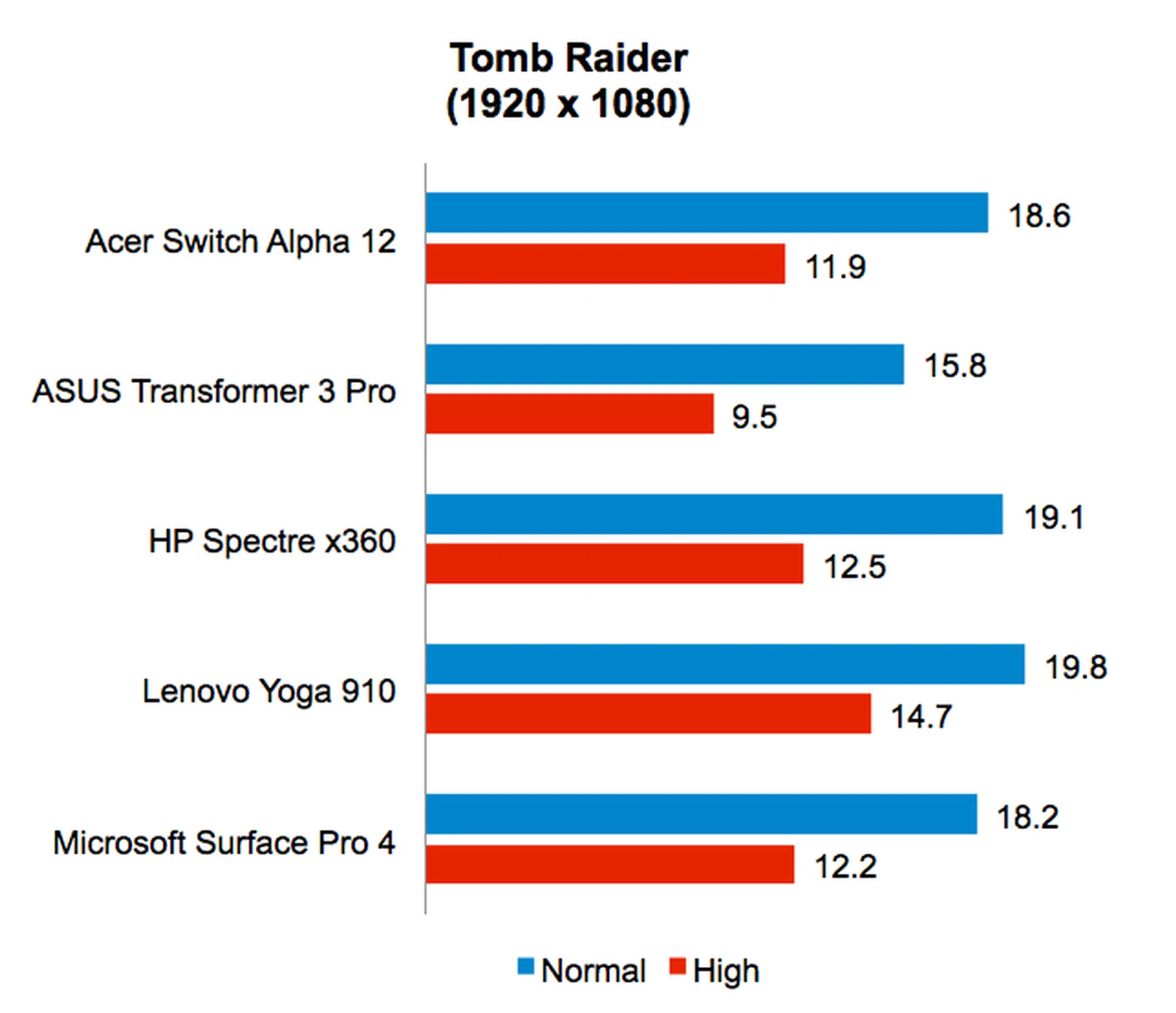 Moving on to real world gaming benchmarks, we see that the Lenovo Yoga 910 has the edge on its competitors. It was about 10% faster than its nearest rivals. Following the Yoga 910, the HP Spectre x360, Acer Switch Alpha 12, and Microsoft Surface Pro 4 all recorded very comparable frame rates. Again, the ASUS Transformer 3 Pro was left trailing. It is quite clear now that its aggressive cooling system is a result of some heating issues, which is also affecting its performance.