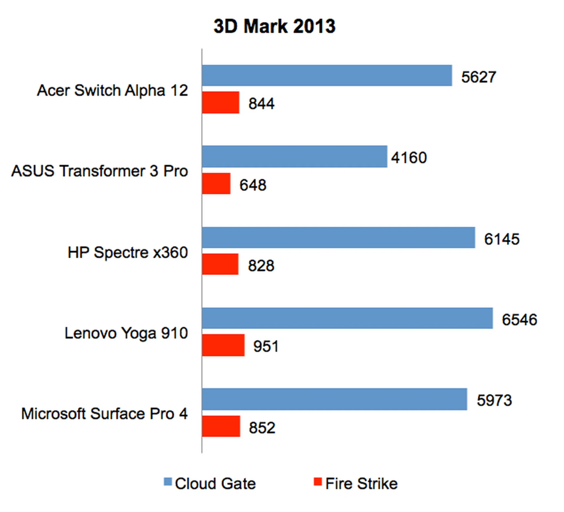 The Lenovo Yoga 910 recorded the highest scores on 3DMark. Its scores were even significantly higher than the HP Spectre x360, which is surprising because the two sport the same Core i7-7500U processor. The Spectre x360, on the other hand, was posted a 9% advantage over the Acer Switch Alpha 12, but only on the less intensive Cloud Gate scenario. The Switch Alpha 12, however, was significantly quicker than the ASUS Transformer 3. Its scores were over 30% better than the Transformer 3 Pro. The Transformer 3 Pro was clearly the poorest performing notebook here, and it seems like there is some sort of a performance throttling going on.