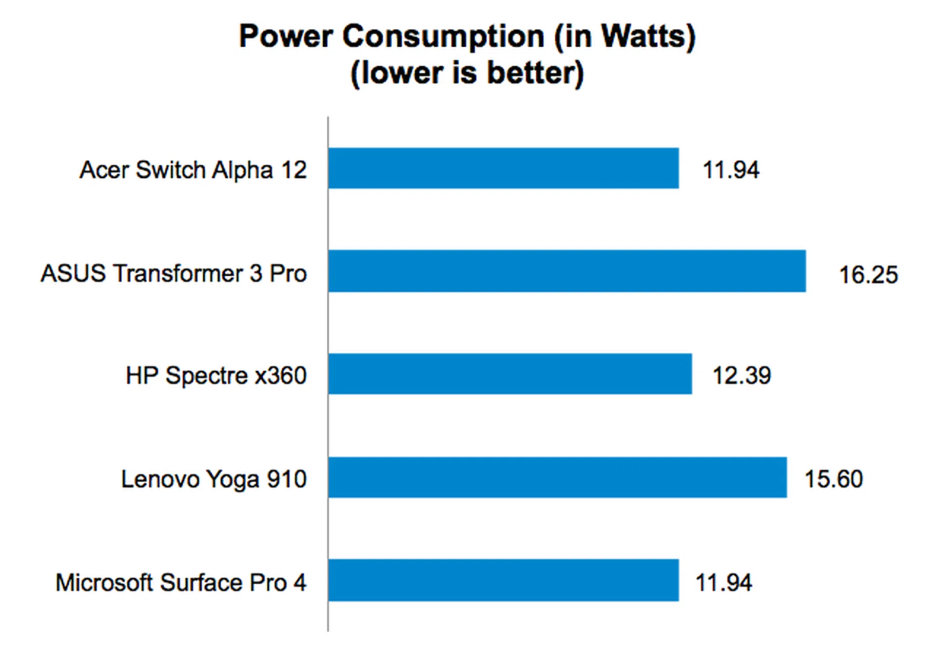 Our battery life test is pretty demanding as it includes a variety of workloads including intensive ones like gaming, photo editing and video conferencing. The Lenovo Yoga 910 managed to last an impressive 300 minutes or 5 hours, which was the longest. The HP Spectre x360 was a close second at 280 minutes. The Acer Switch Alpha 12 and ASUS Transformer 3 Pro couldn’t hope to compete because their batteries are significantly smaller. But even so, the Transformer 3 Pro’s battery life of just 144 minutes, or slightly under two and a half hours, was quite disappointing. The Microsoft Surface Pro 4, which has the same battery capacity, managed 196 minutes or nearly an hour longer. On the other hand, the Acer Switch Alpha 12's battery life was quite impressive, considering it has the smallest battery - this you can reference from our power consumption graph below.