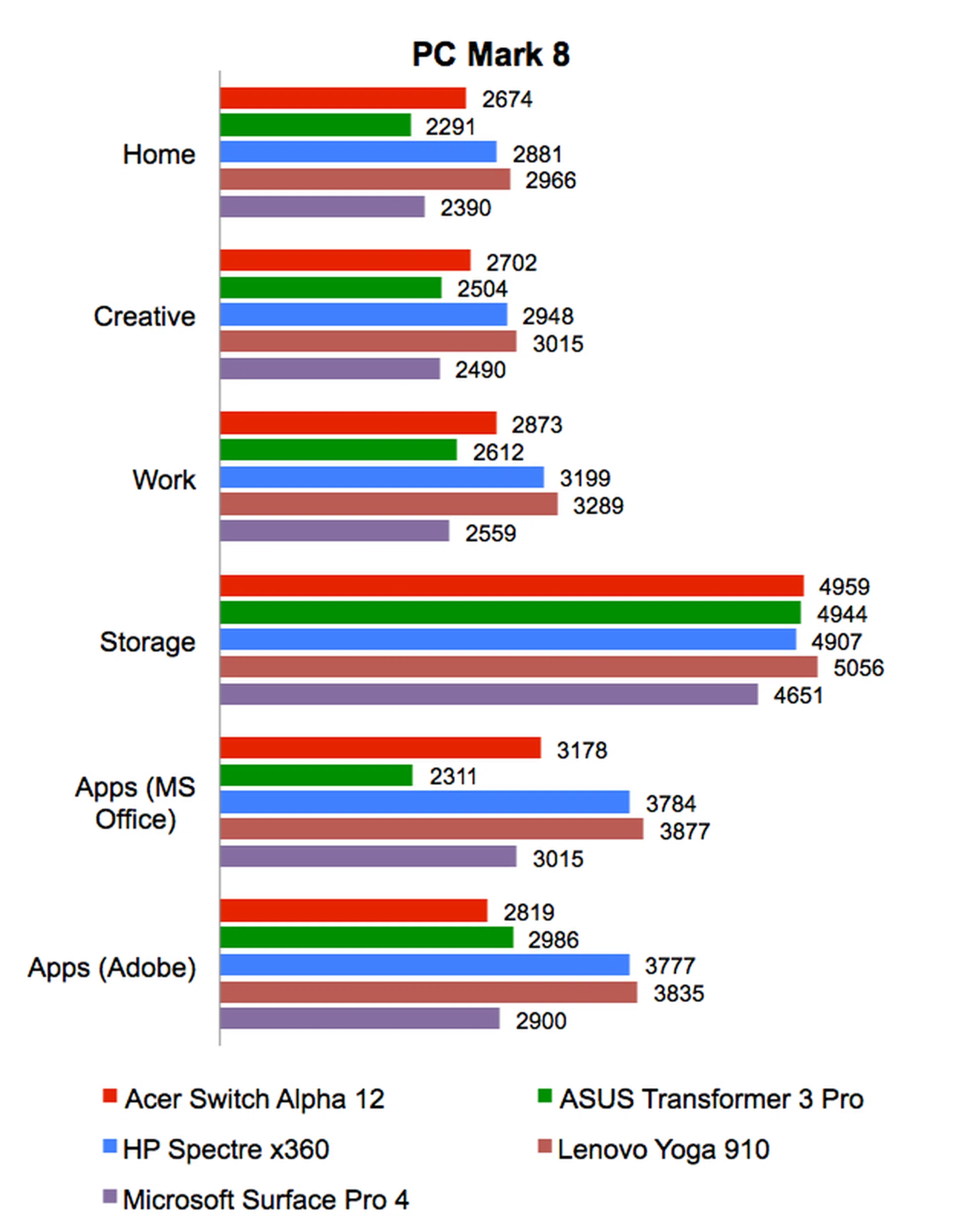 The Lenovo Yoga 910 was once again the clear leader, followed by the trio of the Spectre x360, Acer Switch Alpha 12 and Microsoft Surface Pro 4. The ASUS Transformer 3 Pro had the poorest result, and it was over 20% slower than the Yoga 910.