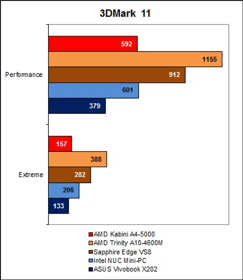 So far, the new Kabini A4-5000 APU in the reference notebook from AMD has been disappointing, but with AMD traditionally performing well in graphics benchmarks, 3DMark 11 will give it a chance to make up for lost ground.
