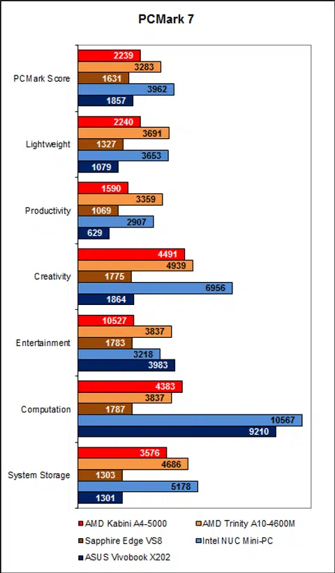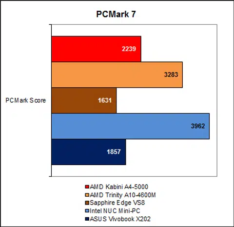 On PCMark 7, the AMD Kabini reference notebook managed to restore some lost pride, scoring 2239 PCMarks, a good 20% more than the ASUS Vivobook’s 1857. It also managed to see off the Sapphire Edge VS8 Mini-PC and its A8-4555M APU, which recorded just 1631 PCMarks - the lowest score. However, the AMD Kabini reference notebook was still some ways off when compared to the AMD Trinity reference book and its A10-4600M APU and the Intel NUC Mini-PC - both of which have SSDs, which would have contributed to their higher scores.