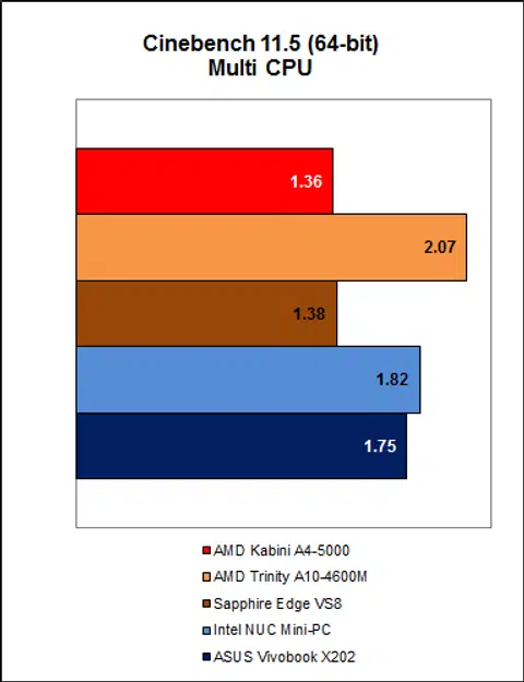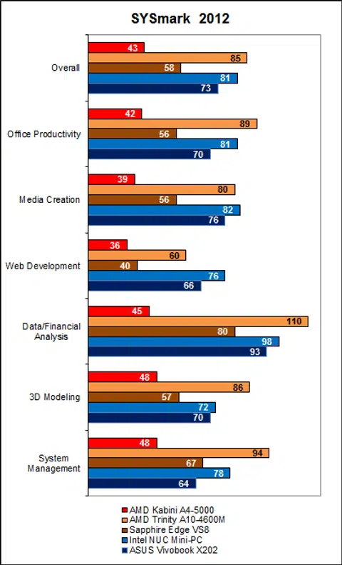 While we haven't really reviewed many entry-level systems, we've put together some test comparisons to get a better idea where exactly does the new Kabini A4-5000 APU stand. For starters, we will be compariing it against AMD’s own A10-4600M from our review of the Trinity notebook platform last year and also the recently reviewed Sapphire Edge VS8 Mini-PC, which has a mid-level Trinity A8-4555M APU. Additionally, from Intel, we will be including results from the Intel NUC Mini-PC and the ASUS Vivobook X202, both of which are powered by the Intel Core i3-3217U processor.