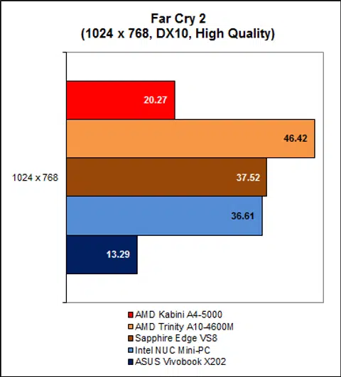 On Far Cry 2, the AMD Kabini reference notebook recorded 20.27 fps, which puts it about 53% ahead of the ASUS Vivobook. However, this was well below the 30 fps threshold for playability. And when you consider that Far Cry 2 has been around for so long and that our test settings weren’t so demanding, the performance of the A4-5000 APU and its integrated Radeon HD 8330G GPU was actually quite disappointing. Even Intel's HD Graphics 4000 engine on the Intel NUC system fared much better. Fortunately for AMD, the Trinity A10-4600M put in a decent showing, recording a respectable 46.42 fps, but that's a more powerful APU competing against mainstream Intel Core i3 and Core i5 processors.