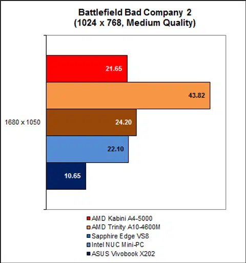 Battlefield Bad Company 2 was one of the first DirectX 11 titles to be released, and the AMD Kabini reference notebook showed improved performance here, clocking 21.65 fps. This was double that of the ASUS Vivobook and about on a pair with the Sapphire Edge VS8 and Intel NUC Mini-PC. However, the flagship A10-4600M Trinity notebook APU was still the best performer, showing the great disparity between AMD’s Kabini and Trinity offerings.
