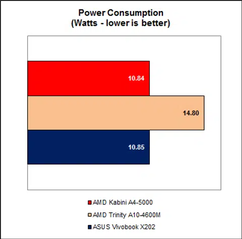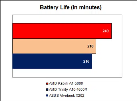 In our test, we found that the AMD Kabini reference notebook has a battery life of around 4 hours and 9 minutes. The Trinity reference notebook managed 3 hours and 38 minutes, while the ASUS Vivobook did 3 hours and 30 minutes. While it is true that the AMD Kabini reference notebook has the longest battery life, its battery was also the largest and has a rating of 45Wh, as opposed to the Vivobook’s 38Wh. If we calculate its power consumption, the two are actually nearly identical. Considering the A4-5000 slightly lower TDP of 15W versus the Core i3-3217U's TDP of 17W, we were expecting it to have slightly better power consumption.