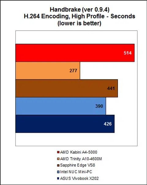 Here, the Trinity A10-4600M managed to complete the transcoding process the quickest, taking 277 seconds. This was followed by the Intel NUC Mini-PC, which took nearly two minutes more. The new Kabini A4-5000 APU was disappointing, taking 8.5 minutes to complete.