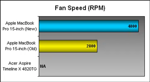 However, we did note the Acer notebook's fan speed noise at maximum loading was pretty loud. The newer MacBook Pro was noticeably quieter even at the 5000RPM range. Unfortunately we weren't able to get any data of Acer's fan speed as the sensor wasn't detected by the various utilities we've tried. As for the difference in temperatures between the Acer notebook and the Apple MBPs, we're guessing the better (and noisier) fan of the Timeline X and its direct exhaust system allows for better overall cooling compared to the MBPs, which had to work around the design aspects (the hidden fan exhaust and perhaps even quiet operation which could have been another design parameter).