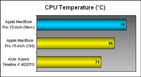 Based on our tests so far, it would seem that the reports of the new MacBook Pro notebooks running hot at close to 100 degrees Celsius are correct, but we've yet to see it break the 100 mark in our test lab. That said, despite it running at close to 100 degrees Celsius, the notebook still performs fine, and the CPU has yet to reach the limit of its maximum specified operating temperature. On the exterior, while it was hot to the touch, it was no where near searing levels of worry.