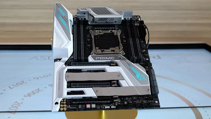 The final member of the Edition 30 trio is the Prime X299 Edition 30 motherboard. This is a high-end LGA2066 board that will hold up to an 18-core Intel Core X processor.