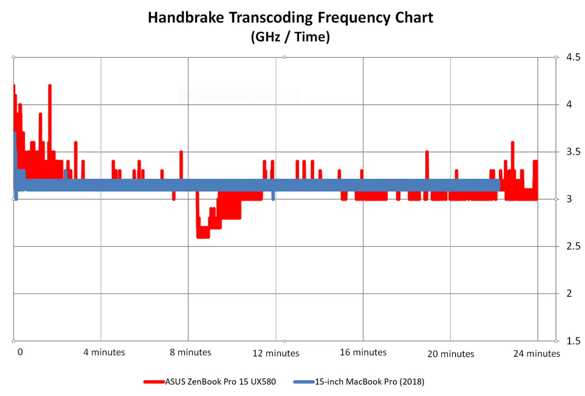 The MacBook Pro, on the other hand, is much more steady in its approach. After an initial ramp up in clock speeds, it quickly settled on a rather constant clock speed of around 3.1 to 3.2GHz. This approach paid off in the end because it took the MacBook Pro 22 minutes and 52 seconds to complete the task, whereas the ZenBook Pro 15 took 24 minutes and 34 seconds. This explains why the MacBook Pro's line ends earlier than the ZenBook Pro 15's.