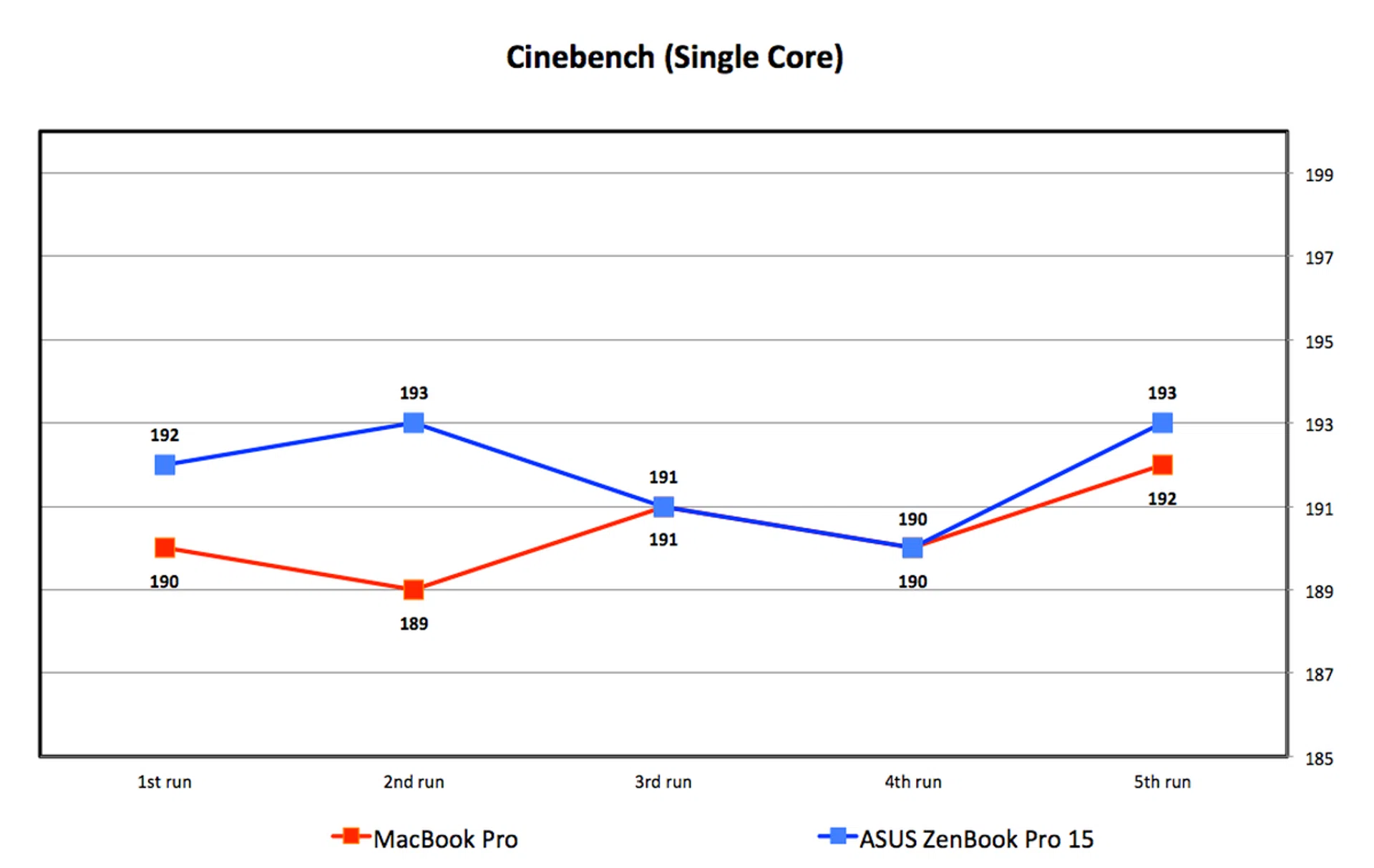 I ran Cinebench five times consecutively to tax the system and to see if performance would dip. Unsurprisingly, the performance was very consistent. However, it is interesting that while both machines' single-core performance was mostly the same, the MacBook Pro recorded lower multi-core scores.