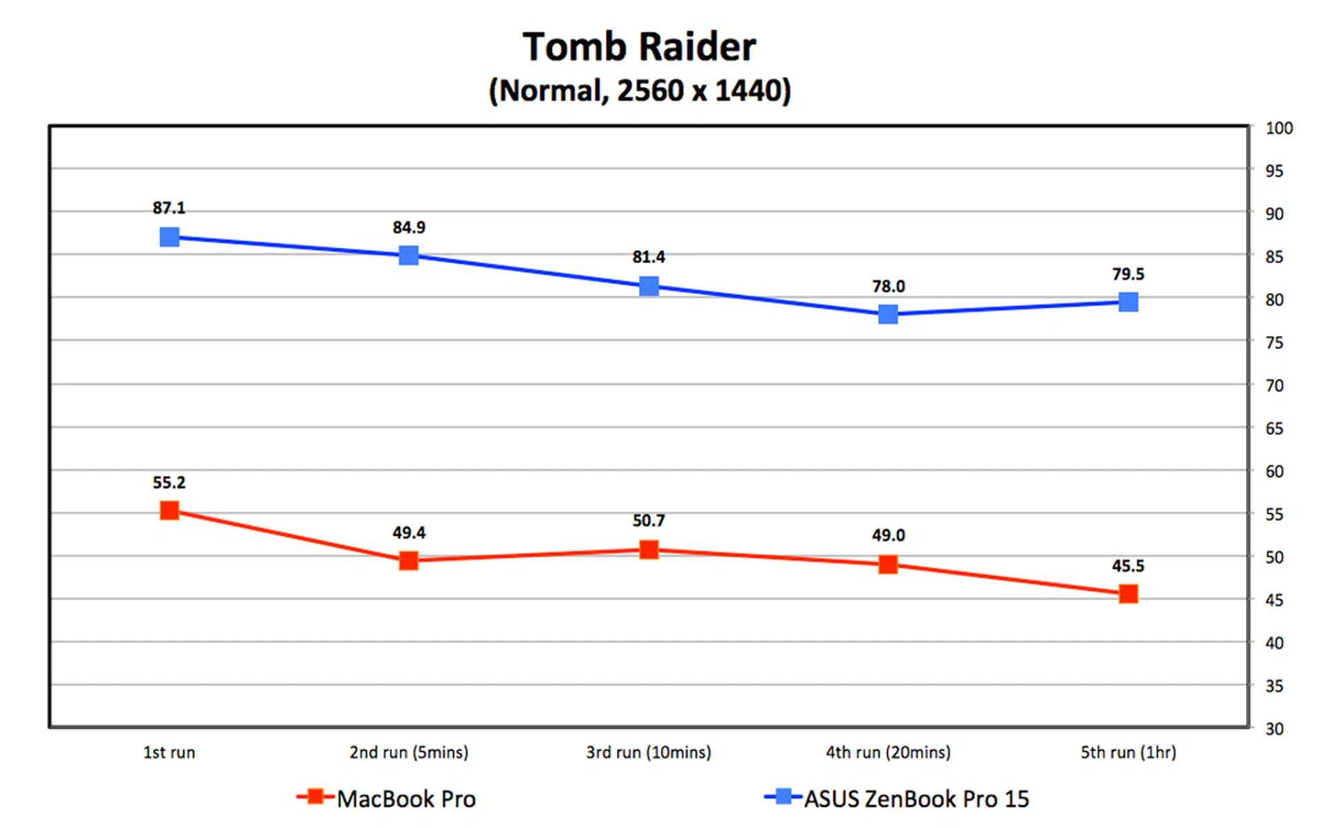 For Tomb Raider, the MacBook Pro was made to run in Windows 10 via Bootcamp to ensure both machine’s GPUs were rendering via the DirectX API. Interestingly, the MacBook Pro’s Radeon Pro 560X ran warmer at a constant 85 degrees Celsius, whereas the ZenBook Pro 15’s GeForce GTX 1050 Ti kept a steady 80 degrees Celsius. For this test, I made five runs at different timing intervals. The benchmark will keep running even after a result is generated, making it an ideal benchmark for evaluating heat soak and throttling.