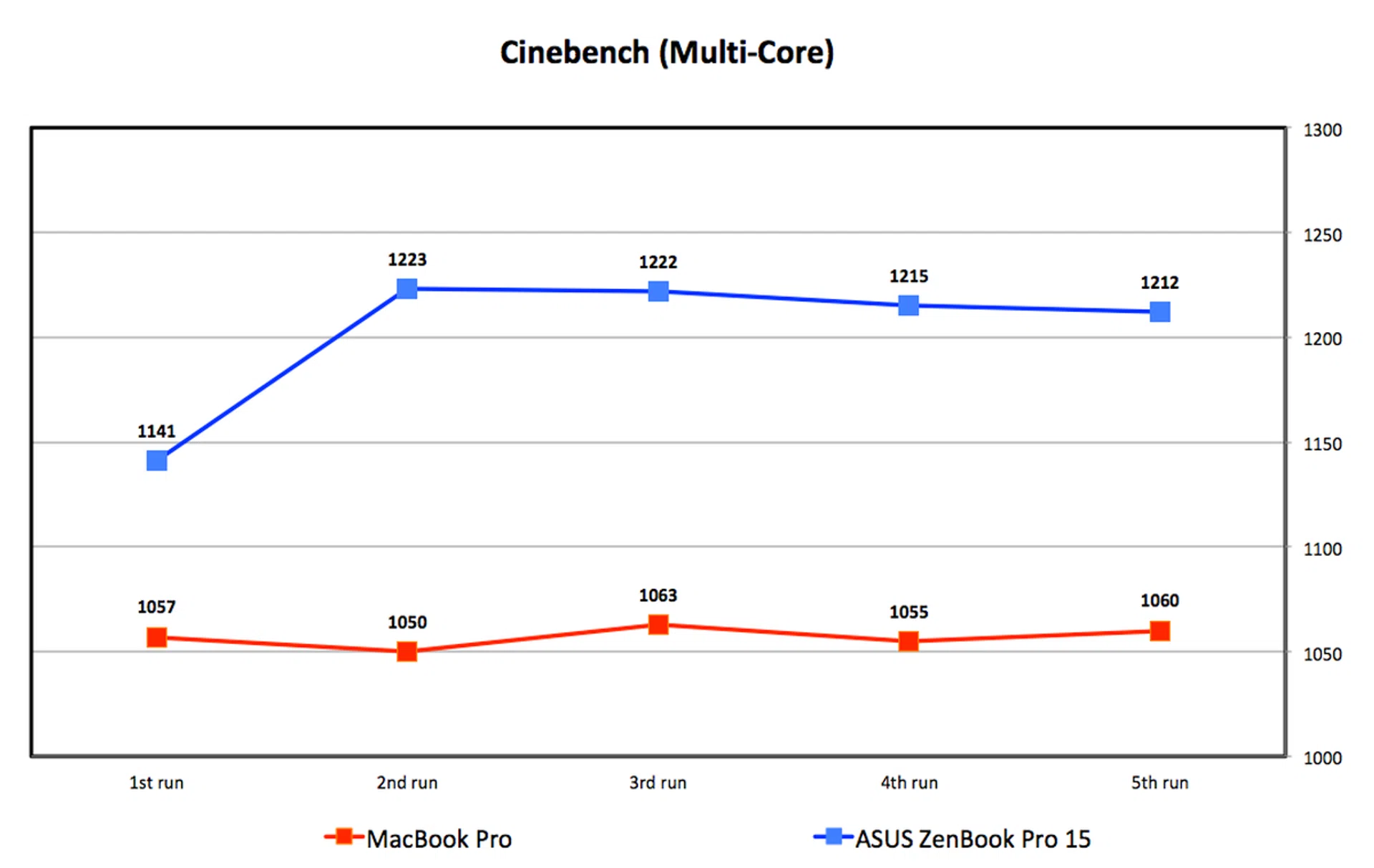 The most likely explanation is that the MacBook Pro was running at more conservative clock speeds than the ZenBook Pro 15. This makes sense because, in the transcoding test above, we noticed that the ZenBook Pro 15 ramped up clock speeds more aggressively during the initial moments of benchmarks and only started throttling after a period of time. Moreover, Cinebench isn’t a particularly long benchmark, which explains the ZenBook Pro 15's higher scores.