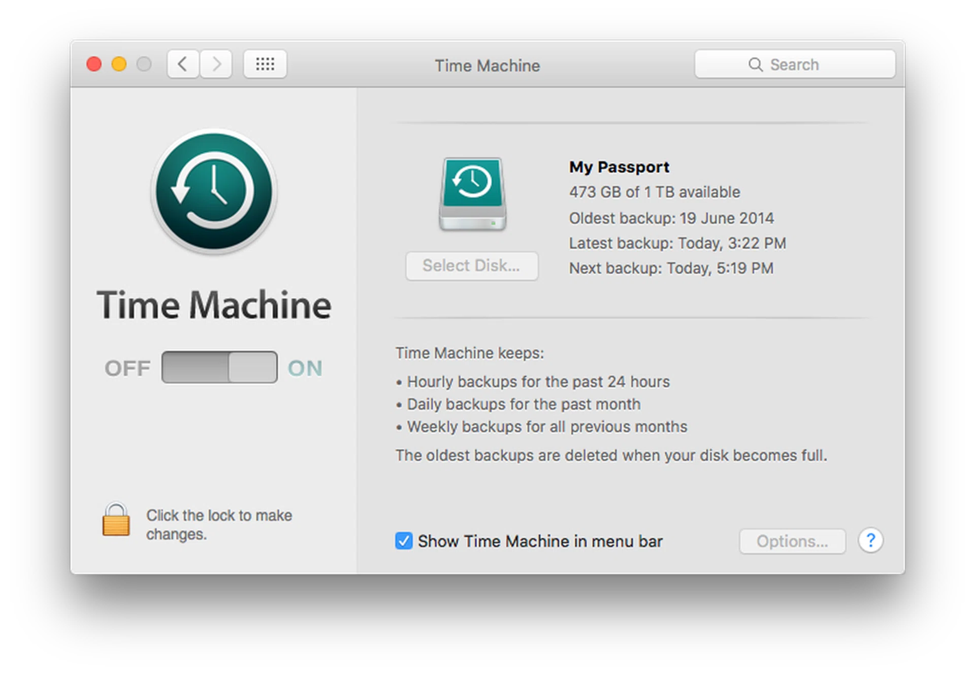 Get an external hard disk and plug it into your Mac. When you’re asked if you want to use it for Time Machine, just say yes. Alternatively, if you already have an external hard disk attached to your Mac, click on ‘Time Machine’ in System Preferences and select the disk you want to use for backups.