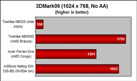 We fired up the popular 3DMark06 synthetic gaming benchmark and it's no surprise to find that Intel's Atom platform performed the worst with a paltry score of a measly 150 3DMarks. The AMD Brazos netbook scores close to 12 times better at 1792 3DMarks, and also beats the older Congo-based Acer Ferrari and the ASRock Ion nettop. Although the NVIDIA solution came pretty close, with scores this close, it may be hard to notice the performance difference. However, from a technological perspective, the AMD Brazos is generally a superior implementation since it achieved this via its built-in GPU, rather than the NVIDIA Ion platform that is still an external solution to complement the Intel Atom processor. The overall platform efficiency, thermals and footprint required tilt to the favor of the AMD Brazos.
