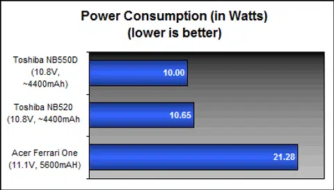 Here's where it gets interesting. Based on what we understand, the Brazos platform is supposedly capable of matching the Intel Atom in terms of power consumption and our battery performance results (based off a looping movie trailer clip) show that the AMD netbook lasted as long or better than the Intel netbook. Since both netbooks use the same battery type, power consumption figures also show that that the AMD netbook has roughly equal power usage compared to the Intel Atom netbook. Not bad at all considering how much better performance you can get while maintaining the same level of battery life.