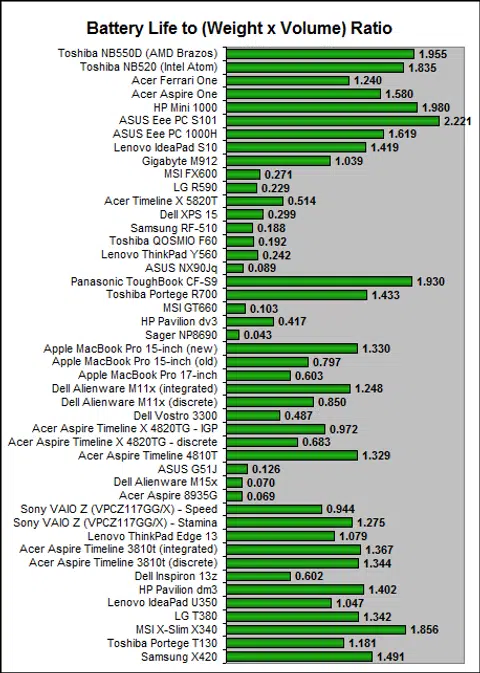 Netbooks are known for their outstanding portability, so our Portability Index graph attempts to give a numerical figure to the question of "just how portable this device is". This figure is obtained by simply diving the notebook's battery uptime by the product of its weight and volume. This results in a ratio, and the higher it is, the more portable a notebook is. Of course, this ratio is only effective for comparing with other products of a similar category and bearing in mind of the three aspects that contribute to this figure. Generally, we use the resulting ratio as a guide and from what we notice, both netbooks are pretty darn portable.